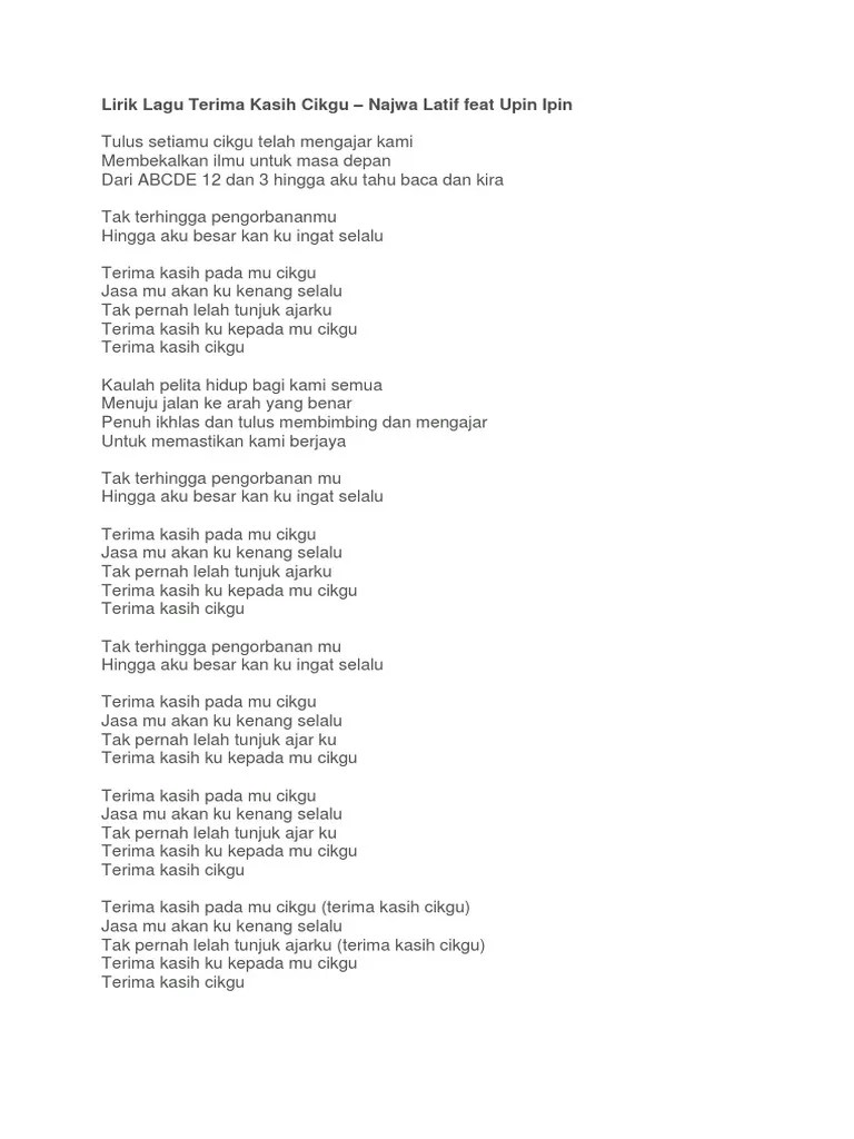 Terima kasihku ku ucapkanpada guruku yang tulusilmu yang berguna slalu di. Syair lagu terima kasih uns. Lirik lagu terima kasihku yang dinyanyikan gita gutawa. Lirik lagu terima kasihku (guruku): Pastikan anda sudah melihat video musiknya. Kan kubuktikan bekal ilmu darimu. Am g f am dm am f g am am g terima kasihku ku ucapkan Lirik lagu terima kasih guruku dari neona. Lirik lagu terima kasih guru. Terima kasihku ku ucapkan pada guruku yang tulus ilmu yang berguna slalu di limpahkan untuk bekalku nanti. Lagu dan lirik terima kasihku di ciptakan oleh sri widodo untuk mengenang . Lirik lagu terima kasihku yang diciptakan oleh sri widodo ini cukup sederhana namun memiliki makna yang mendalam sehingga lagu ini sering . Terima kasihku ku ucapkan, cocok dinyanyikan saat hari guru.